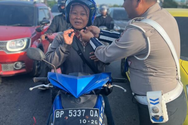 Satlantas Polresta Barelang Laksanakan Himbauan Tertib Berlalu Lintas dan Pembagian Helm Ops Keselamatan Seligi 2026